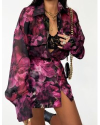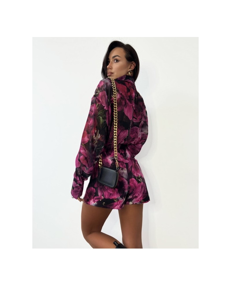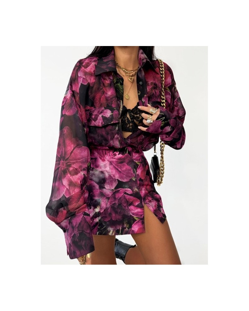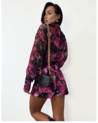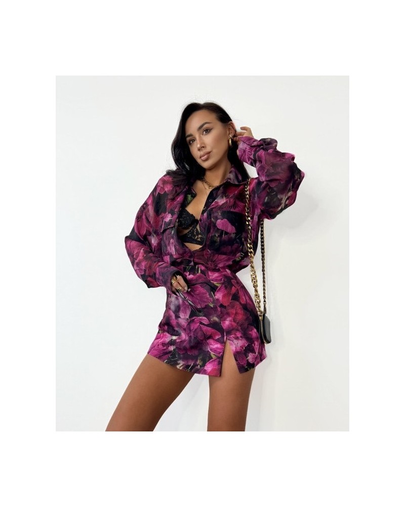 Całość przyciąga uwagę pięknym, kwiatowym printem w odcieniach fuksji, purpury i czerni – idealnym na sezon wiosna-lato, ale równie dobrze sprawdzi się także w zestawieniu z rajstopami jesienią. Delikatne rozcięcie z przodu dodaje lekkości i subtelnego pazura