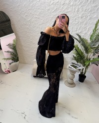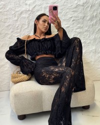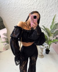 Czarna bluzka hiszpanka wykonana z efektownej koronki to idealna propozycja na lato. Krótki fason z elastyczną gumką w pasie i dekolcie pięknie podkreśla sylwetkę, a szerokie bufiaste rękawy dodają lekkości i charakteru.