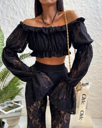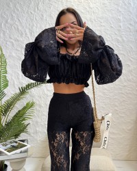 Czarna bluzka hiszpanka z koronki z bufiastymi rękawami. Kobiecy krój, idealny na letnie stylizacje i wieczorne wyjścia.