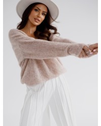 Ten puszysty sweter to połączenie przytulnego komfortu z kobiecym stylem. Wykonany z niezwykle miękkiego, delikatnego materiału, który przyjemnie otula ciało i zapewnia ciepło w chłodniejsze dni. Głęboki dekolt w serek pięknie eksponuje szyję i sprawia, że sweter doskonale sprawdzi się zarówno w codziennych, jak i bardziej eleganckich stylizacjach. Luźniejszy krój oraz długie rękawy zapewniają wygodę i swobodę ruchów. To doskonały wybór na jesień i zimę – niezastąpiony element kobiecej garderoby.