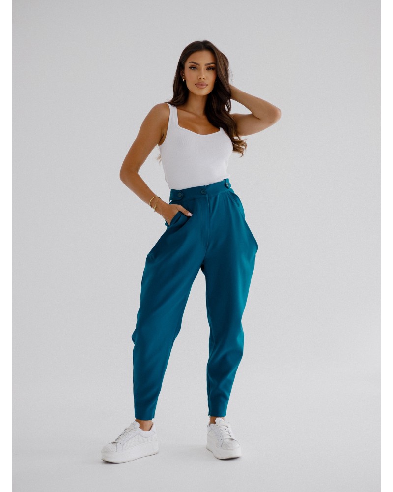 Te eleganckie spodnie z wysokim stanem to połączenie klasyki i nowoczesnego designu. Model charakteryzuje się dekoracyjnymi guzikami w pasie oraz efektownym marszczeniem przy biodrach, które nadają całości unikalnego charakteru. Wykonane z elastycznego materiału, zapewniają wygodę noszenia i idealne dopasowanie do sylwetki. Spodnie świetnie sprawdzą się zarówno w codziennych stylizacjach, jak i w bardziej formalnych zestawieniach do pracy czy na spotkania. Praktyczne kieszenie zwiększają ich funkcjonalność, a zwężane nogawki podkreślają nowoczesny fason.