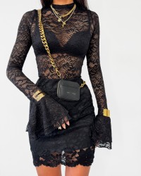 Elegancka bluzka wykonana z delikatnej koronki, wyróżniająca się dopasowanym krojem i wysokim dekoltem. Przezroczysty materiał subtelnie podkreśla sylwetkę, a misterny wzór dodaje całości wyjątkowego charakteru. Długie, lekko rozszerzane rękawy zakończone koronkowym wykończeniem nadają projektowi lekkości i romantyzmu. Idealny wybór na wieczorne wyjścia, uroczyste kolacje czy specjalne okazje, doskonale komponuje się zarówno ze spódnicami, jak i eleganckimi spodniami.