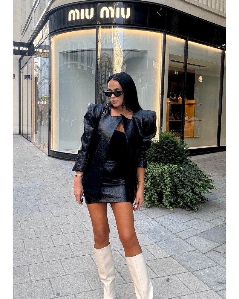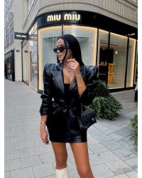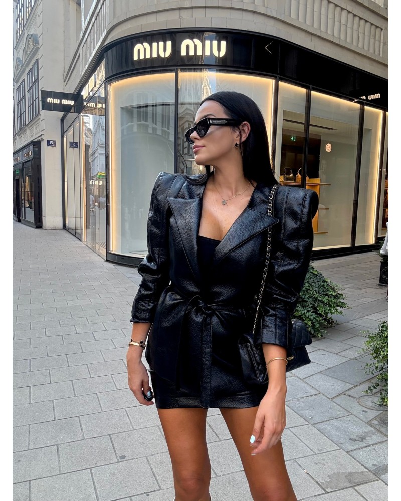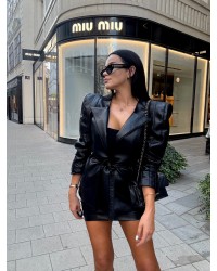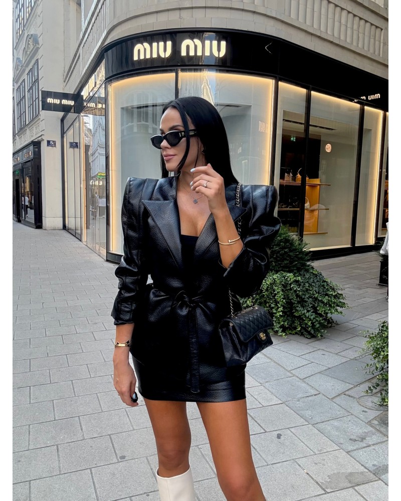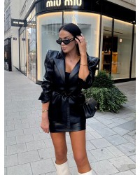 Sukienka marynarkowa ze skórzanym wykończeniem i paskiem w talii, która łączy elegancję z nowoczesnym charakterem.