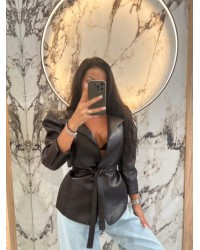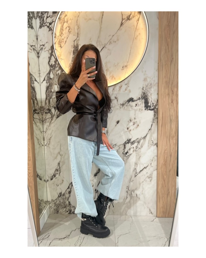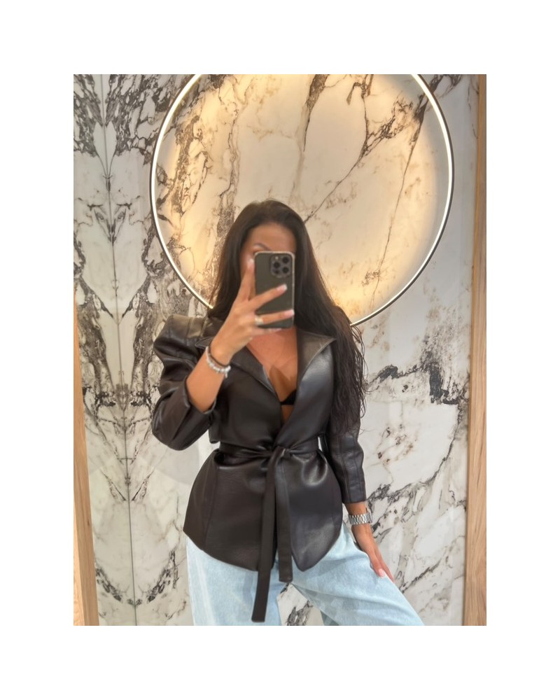 Sukienka marynarkowa ze skórzanym wykończeniem i paskiem w talii, która łączy elegancję z nowoczesnym charakterem.