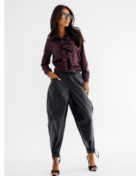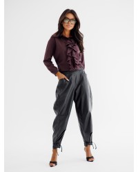 Spodnie z ekoskóry o luźnym kroju z kieszeniami i ściągaczem w pasie. Stylowy wybór na co dzień i na wieczorne wyjścia.