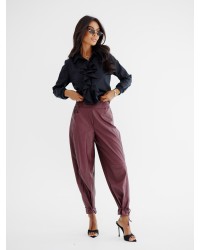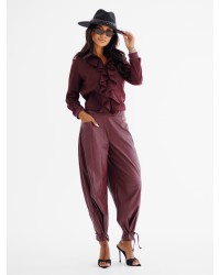 Spodnie z ekoskóry o luźnym kroju z kieszeniami i ściągaczem w pasie. Stylowy wybór na co dzień i na wieczorne wyjścia.