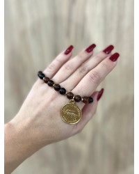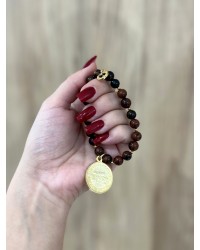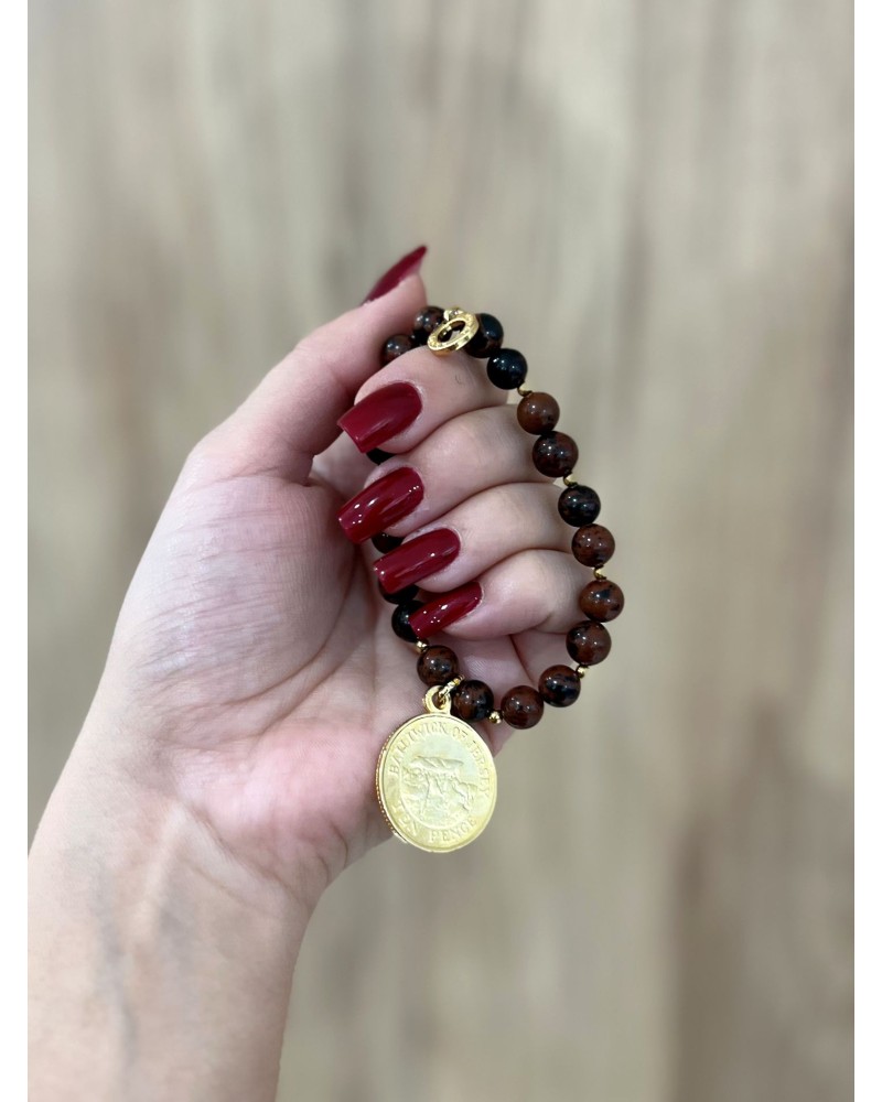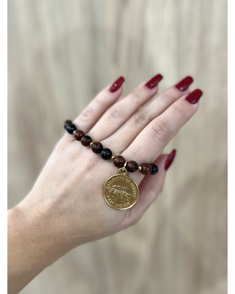 Bransoletka z naturalnego obsydianu mahoniowego, ozdobiona złotą monetą. Połączenie surowej siły natury i ponadczasowej elegancji.