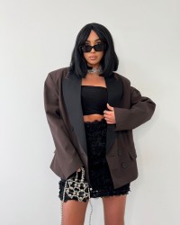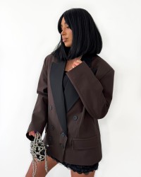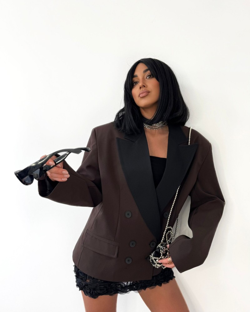 Stylowa i ponadczasowa czarna marynarka o luźnym, oversize'owym kroju, zapinana na dwa rzędy guzików. Klasyczne klapy oraz dopracowane detale nadają jej elegancki charakter. Doskonale sprawdzi się zarówno w zestawieniu z garniturowymi spodniami, jak i w mniej formalnych stylizacjach – np. z jeansami lub sukienką. Idealna na spotkania biznesowe, wieczorne wyjścia czy jako modny element codziennego looku. Uniwersalna, szykowna i zawsze na czasie.