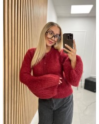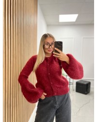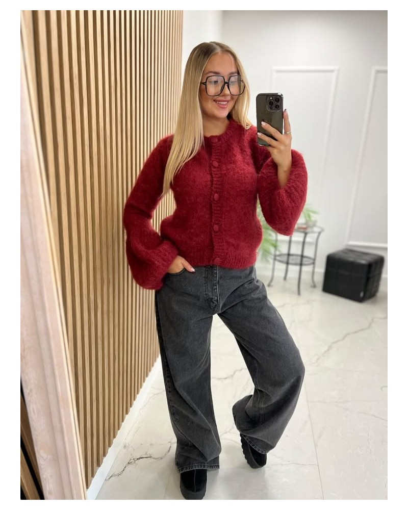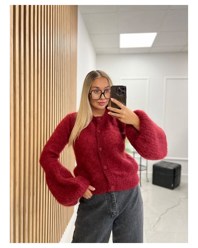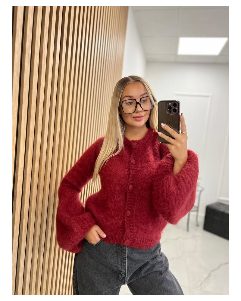 Elegancki, miękki kardigan o krótszym kroju, wykonany z puszystej dzianiny o lekkim włosiu. Model posiada klasyczne zapięcie na guziki w tym samym odcieniu oraz zaokrąglony dekolt, który subtelnie eksponuje szyję. Luźne rękawy zakończone lekkim ściągaczem dodają swobody i kobiecego charakteru. Idealny do noszenia solo lub w warstwowych stylizacjach – świetnie wygląda zarówno z eleganckimi spodniami, jak i z jeansami. To ponadczasowy element garderoby, który sprawdzi się w chłodniejsze dni.