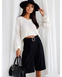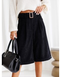 Stylowe szorty z prążkowanej tkaniny to must-have w szafie każdej miłośniczki mody. Model z wysokim stanem pięknie podkreśla talię, a dołączony pasek z klamrą pozwala na idealne dopasowanie. Luźniejszy krój nogawek zapewnia wygodę noszenia i swobodę ruchów, a wywijane nogawki nadają całości lekko nonszalanckiego charakteru. Kieszenie po bokach dodają funkcjonalności. Te szorty to doskonały wybór zarówno na co dzień, jak i na bardziej eleganckie wyjścia w połączeniu z botkami lub kozakami