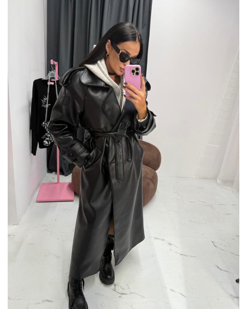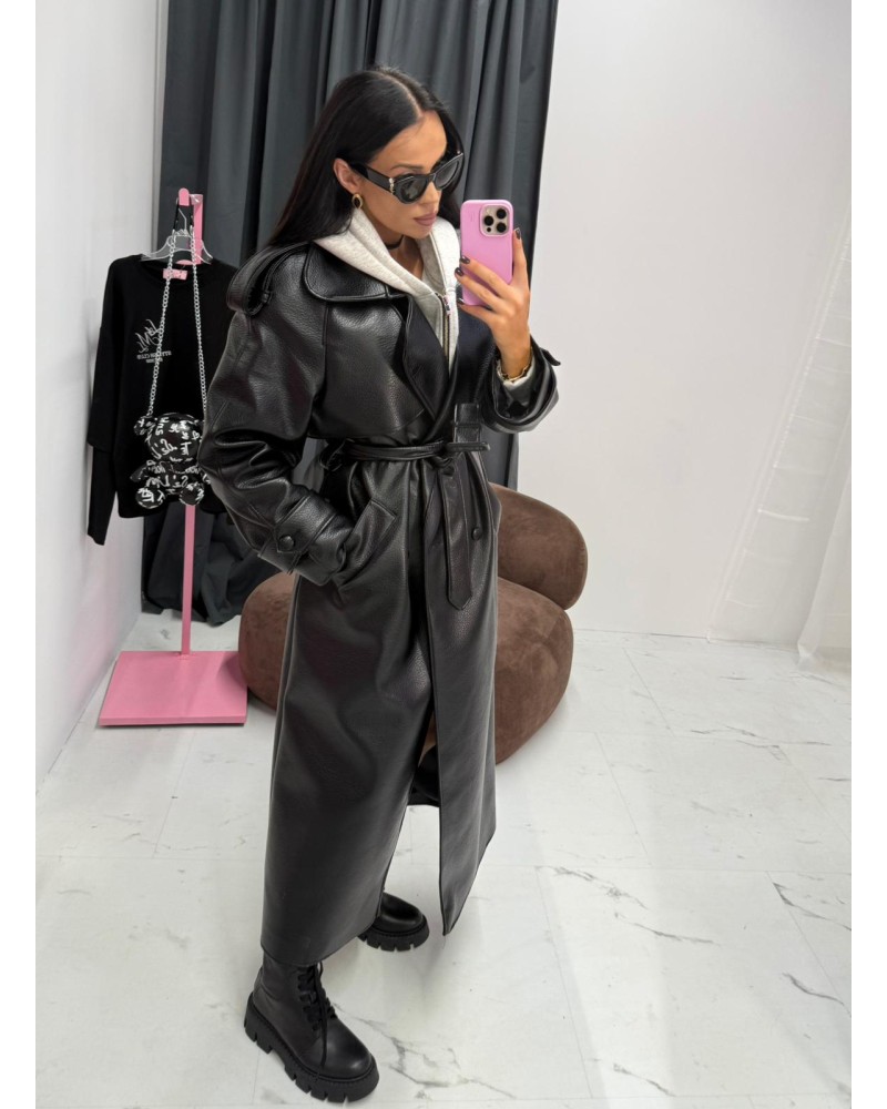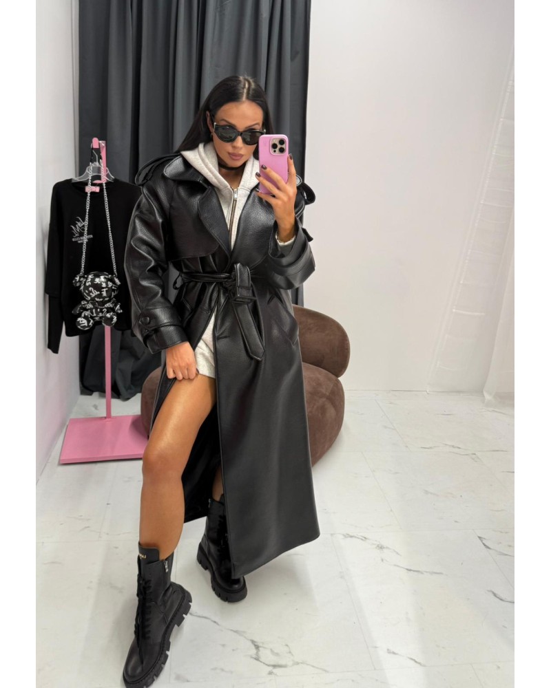 Długi płaszcz z eko skóry to propozycja dla kobiet, które lubią wyróżniać się stylem. Wykonany z wysokiej jakości, lekko połyskującej skóry ekologicznej, przyciąga wzrok i dodaje charakteru każdej stylizacji. Klasyczny, wydłużony fason z dużym kołnierzem i wiązaniem w talii pięknie podkreśla sylwetkę, tworząc efekt „power look”.