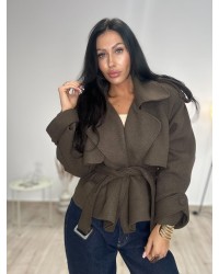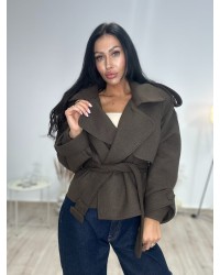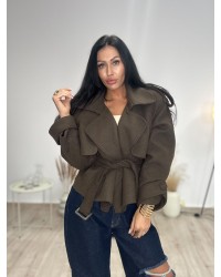 Elegancki krótki płaszcz z paskiem wiązanym w talii to idealna propozycja na chłodniejsze dni. Posiada szerokie rękawy, które nadają stylizacji modowego charakteru, oraz ozdobne detale przy ramionach. Dzięki oversize'owemu fasonowi i długości do bioder świetnie prezentuje się zarówno w casualowych, jak i bardziej eleganckich stylizacjach. Miękka tkanina zapewnia komfort noszenia i swobodę ruchów. To must-have w garderobie każdej kobiety ceniącej styl i wygodę.