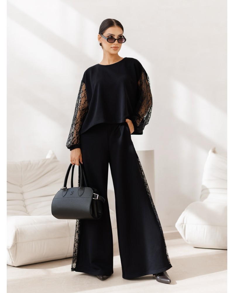 Nowoczesna bluza o kobiecym charakterze, łącząca wygodę z subtelną elegancją. Model wyróżnia się unikalnym połączeniem klasycznego kroju z dekoracyjnymi, koronkowymi rękawami. Transparentne wstawki nadają bluzie lekkości i dodają wyrafinowanego akcentu, który przyciąga spojrzenia.
