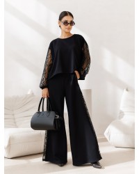 Szerokie spodnie z ozdobnymi wstawkami z koronki po bokach. Idealne połączenie komfortu i stylu w nowoczesnej odsłonie.