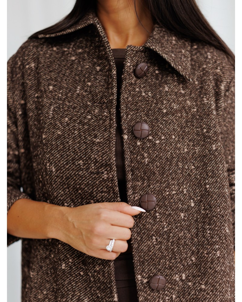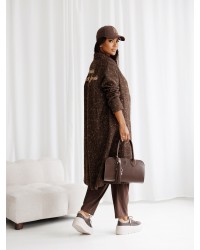 Ten wyjątkowy płaszcz to połączenie wygody, ponadczasowego stylu i modnego wykończenia. Uszyty z tkaniny o wyrazistej fakturze, zapewnia komfort noszenia i wyróżnia się nietuzinkowym wyglądem. Luźny krój i długość za kolano sprawiają, że płaszcz doskonale sprawdzi się zarówno w miejskich stylizacjach, jak i w bardziej eleganckich zestawieniach.