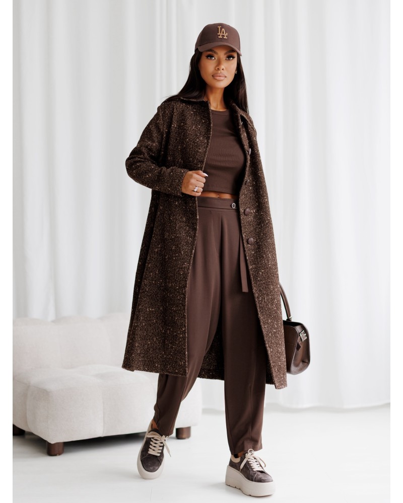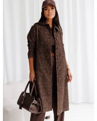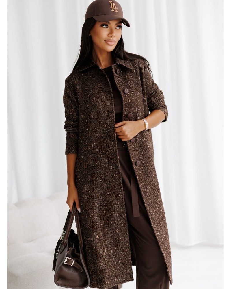 Stylowy, długi płaszcz o klasycznym kroju wykonany z miękkiej, przyjemnej w dotyku tkaniny z ozdobną fakturą. Zapinany na guziki, idealny do codziennych i casualowych stylizacji.