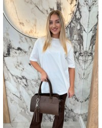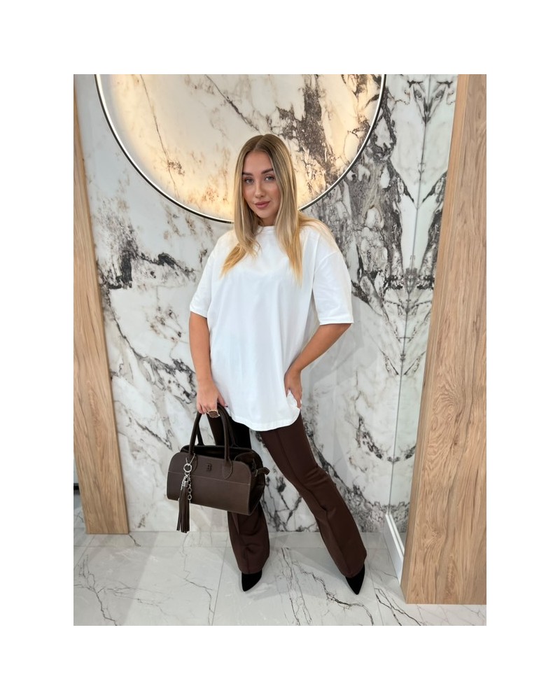 T-shirt damski w fasonie oversize to obowiązkowy element każdej garderoby. Wykonany z miękkiego, przyjemnego w dotyku materiału, gwarantuje komfort noszenia przez cały dzień. Klasyczny krój z delikatnie opadającymi ramionami i luźnym dopasowaniem sprawia, że świetnie wygląda zarówno solo, jak i pod marynarką czy swetrem. Doskonale komponuje się z jeansami, legginsami czy spódnicą. Minimalistyczny design czyni go uniwersalnym wyborem na każdą okazję – od codziennych wyjść po bardziej dopracowane stylizacje.