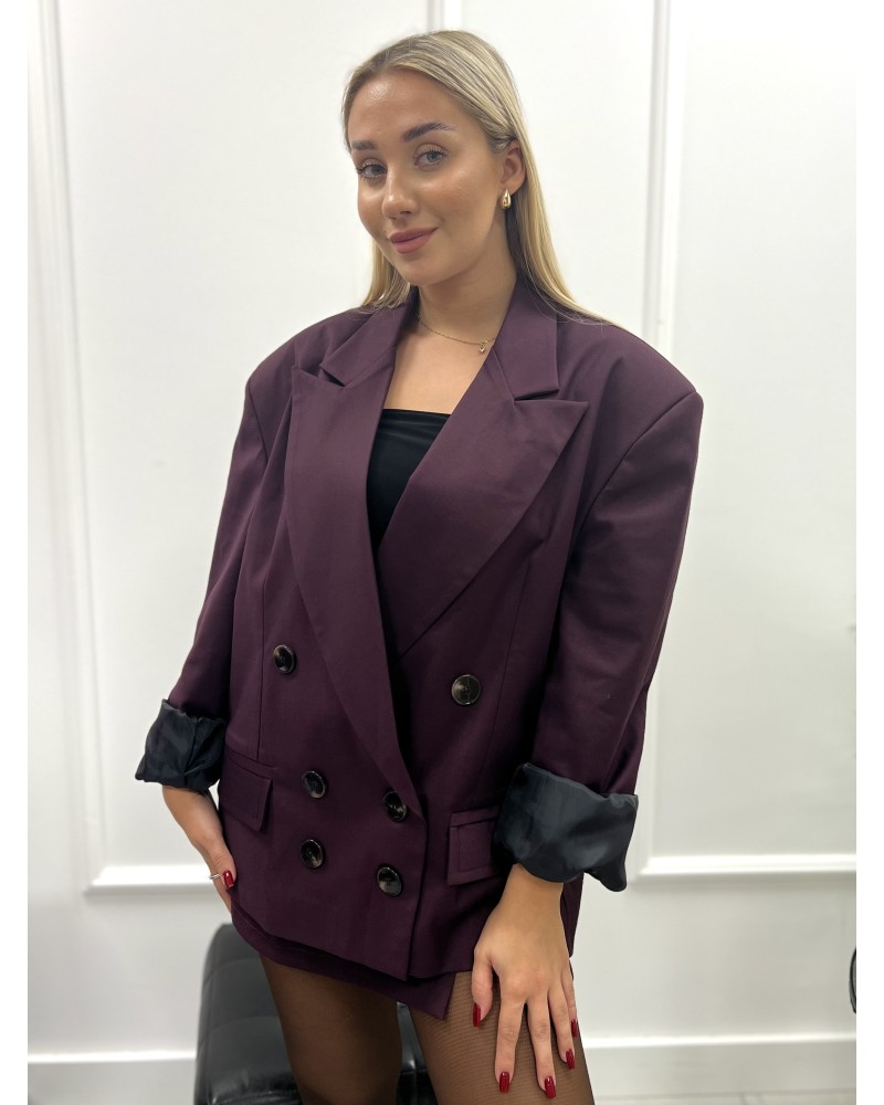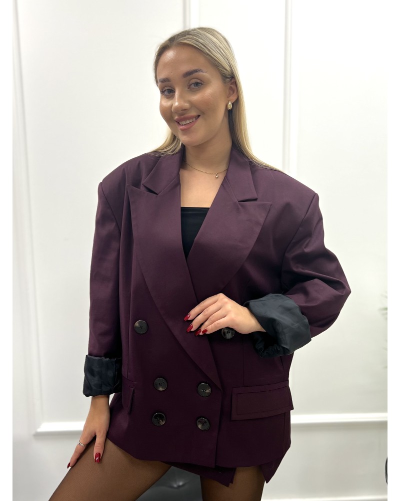 Elegancka marynarka o oversize’owym kroju z podkreśloną linią ramion i dwurzędowym zapięciem. Stylowy wybór na wieczór i na co dzień.