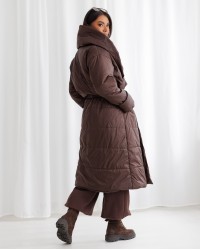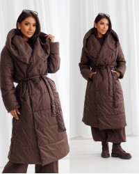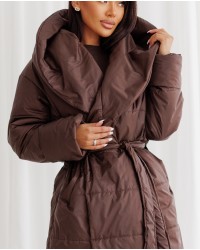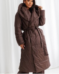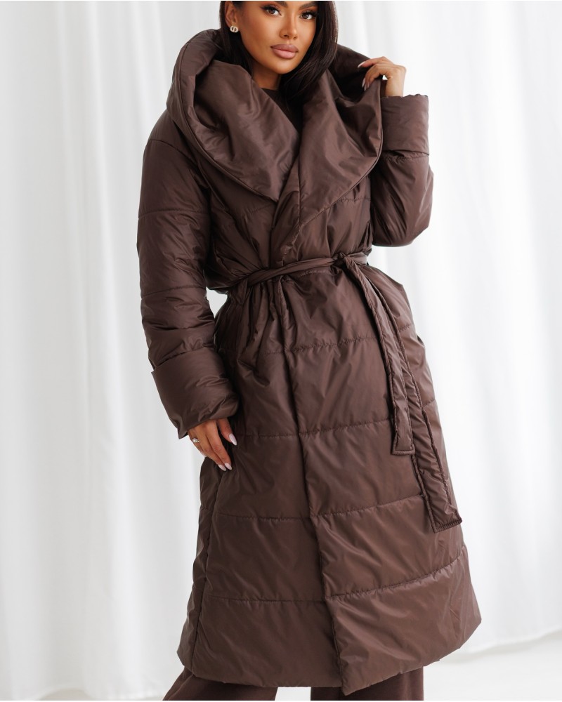 Otulająca kurtka typu kołdra to idealne połączenie funkcjonalności i modnego designu. Model bez zapięcia na guziki, wiązany w talii szerokim paskiem, który podkreśla sylwetkę i zapewnia wygodę noszenia. Posiada obszerny, miękki kołnierz, który tworzy efektowny kaptur – chroni przed zimnem i dodaje całości nowoczesnego charakteru. Długość za kolano i ciepłe wypełnienie sprawiają, że kurtka doskonale sprawdzi się w sezonie jesienno-zimowym. Świetny wybór dla kobiet ceniących komfort i styl w jednym.