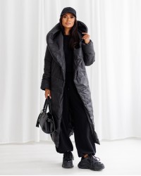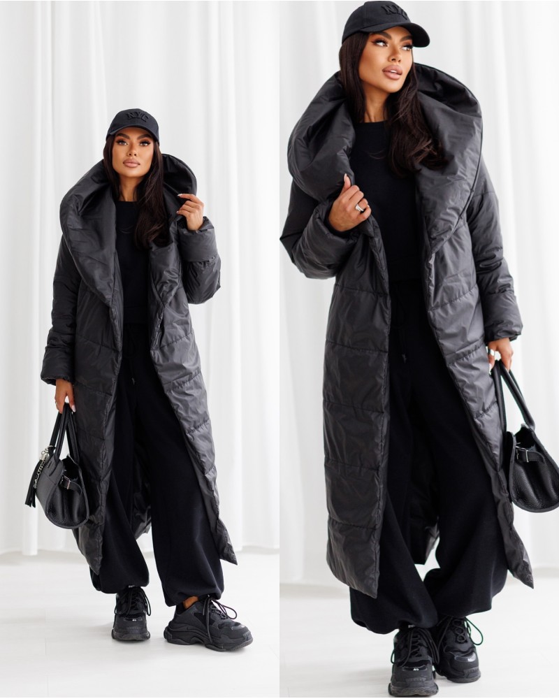Otulająca kurtka typu kołdra to idealne połączenie funkcjonalności i modnego designu. Model bez zapięcia na guziki, wiązany w talii szerokim paskiem, który podkreśla sylwetkę i zapewnia wygodę noszenia. Posiada obszerny, miękki kołnierz, który tworzy efektowny kaptur – chroni przed zimnem i dodaje całości nowoczesnego charakteru. Długość za kolano i ciepłe wypełnienie sprawiają, że kurtka doskonale sprawdzi się w sezonie jesienno-zimowym. Świetny wybór dla kobiet ceniących komfort i styl w jednym.