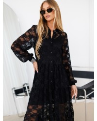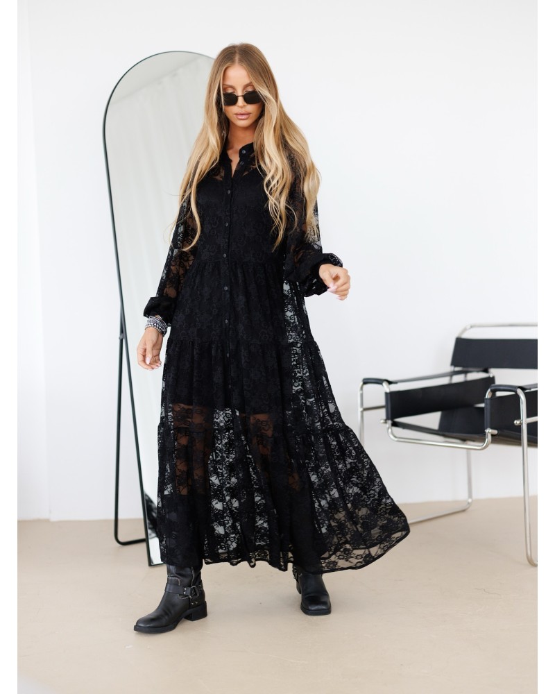 Koronkowa sukienka maxi o zwiewnym kroju z długim rękawem i eleganckim wykończeniem. Idealna na wyjątkowe okazje i codzienne stylizacje w stylu boho.