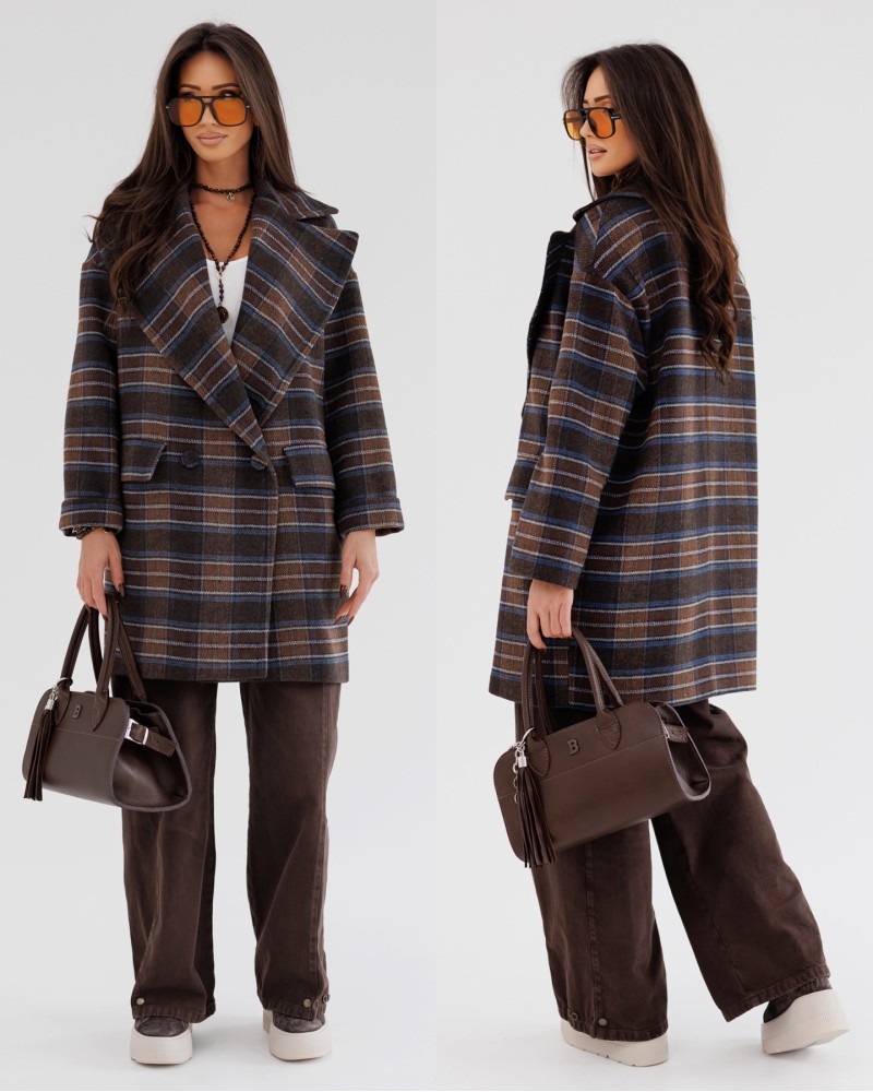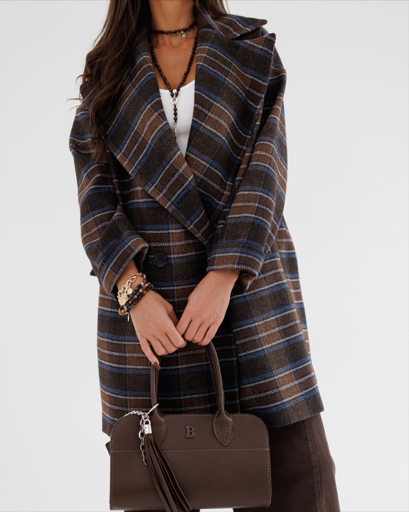Stylowy płaszcz w kratę o klasycznym kroju z klapami i kieszeniami. Idealny na chłodniejsze dni – modny i ponadczasowy.