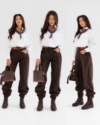 Czekoladowe jeansy o fasonie balloon z ozdobnymi guziczkami przy nogawkach – modny krój, wygoda i styl w jednym. Idealne do casualowych i eleganckich stylizacji.