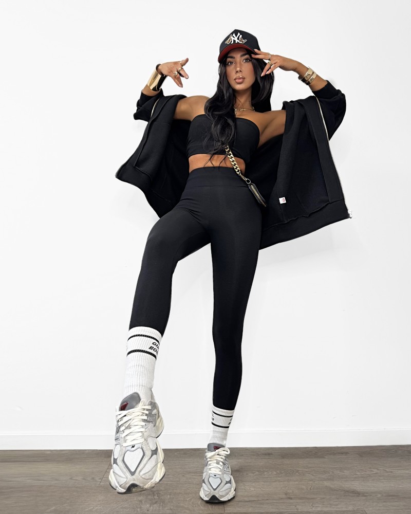 Legginsy wykonane z elastycznego materiału, idealnie dopasowujące się do ciała. Uniwersalny fason sprawdzi się zarówno do stylizacji sportowych, jak i miejskich. Komfortowe w noszeniu, świetnie wyglądają w komplecie z dresową marynarką.