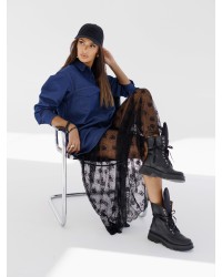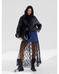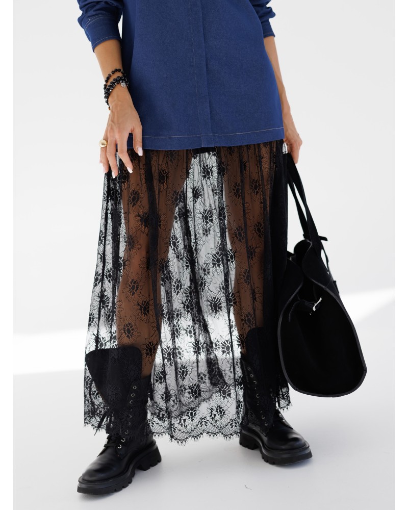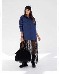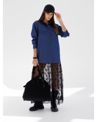 Stylizacja, która łączy luz i elegancję w perfekcyjnym wydaniu. Koszulowa sukienka o kroju oversize nadaje całości nowoczesnego charakteru, zapewniając jednocześnie wygodę i swobodę ruchów. Zestawiona z długą, koronkową spódnicą tworzy efektowny kontrast – połączenie miejskiego stylu z romantyczną subtelnością.