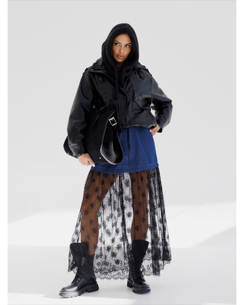 Całość dopełniają modne dodatki – duża torba, czapka z daszkiem i cięższe buty, które przełamują delikatność koronki, nadając stylizacji odważnego charakteru. To doskonały wybór dla kobiet, które lubią bawić się modą i szukają oryginalnych połączeń na każdą okazję.
