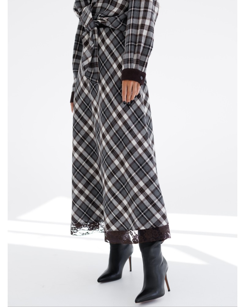 Spódnica o długości maxi w klasyczny wzór z koronkowym wykończeniem. Zwiewny krój zapewnia wygodę, a eleganckie detale nadają jej wyjątkowego uroku.