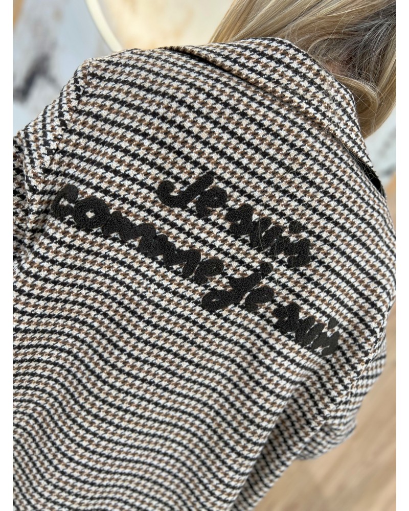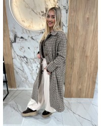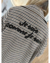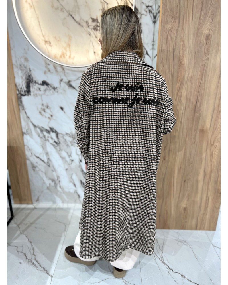 Elegancki płaszcz w pepitkę z napisem “Je suis comme je suis” to połączenie klasyki i nowoczesnego stylu. Wykonany z przyjemnego w dotyku, ciepłego materiału, zapewnia komfort i doskonałe dopasowanie w każdej stylizacji.