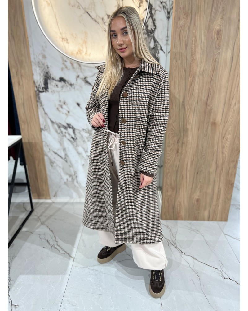 Stylowy płaszcz w pepitkę z ozdobnym haftem na plecach. Klasyczny krój z kołnierzem i guzikami łączy elegancję z francuskim charakterem. Idealny na chłodniejsze dni.