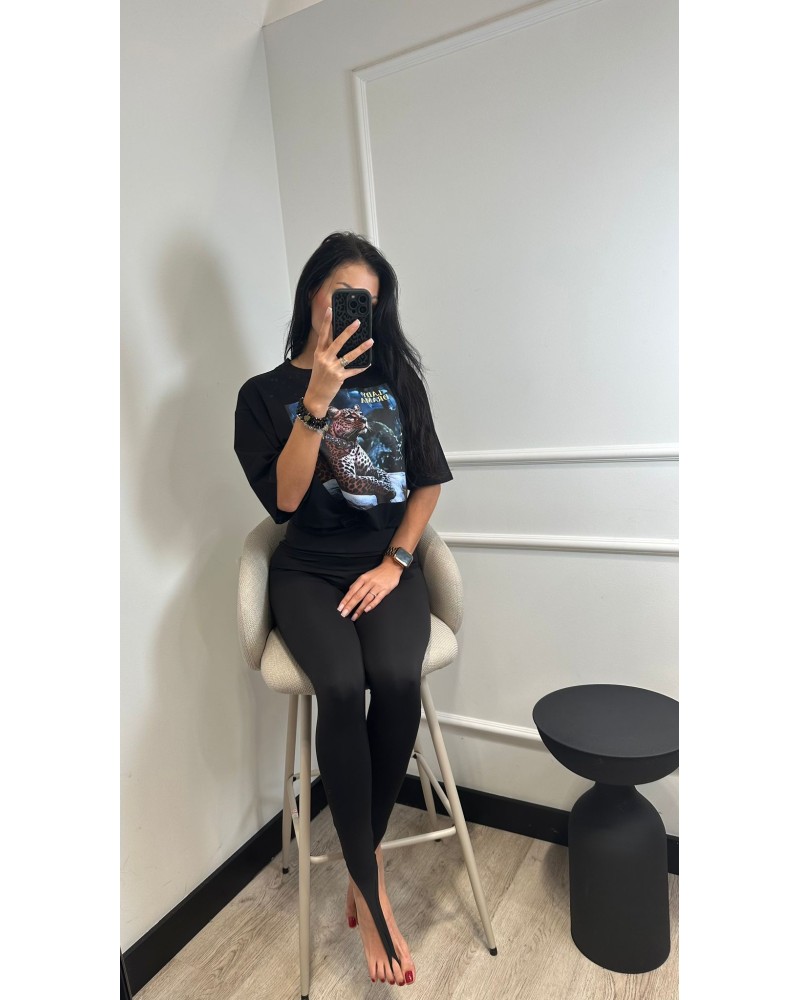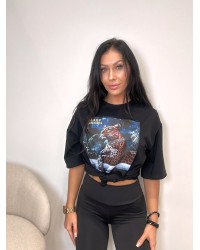 Efektowny t-shirt z nadrukiem to połączenie mody ulicznej i eleganckiego detalu. Luźny fason z lekko opuszczoną linią ramion gwarantuje wygodę, a designerski nadruk z motywem lamparta i napisem “Lady Drama” nadaje mu wyrazistego charakteru.