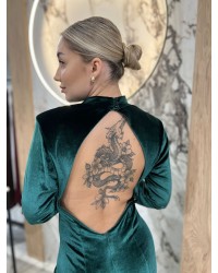 Sukienka posiada długie rękawy oraz efektowne wycięcie na plecach, które nadaje całości niepowtarzalnego uroku i subtelnej drapieżności. Dopasowany krój podkreśla sylwetkę, a niewielkie rozcięcie z tyłu zapewnia swobodę ruchu.