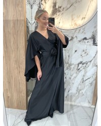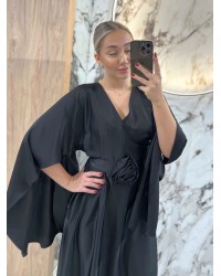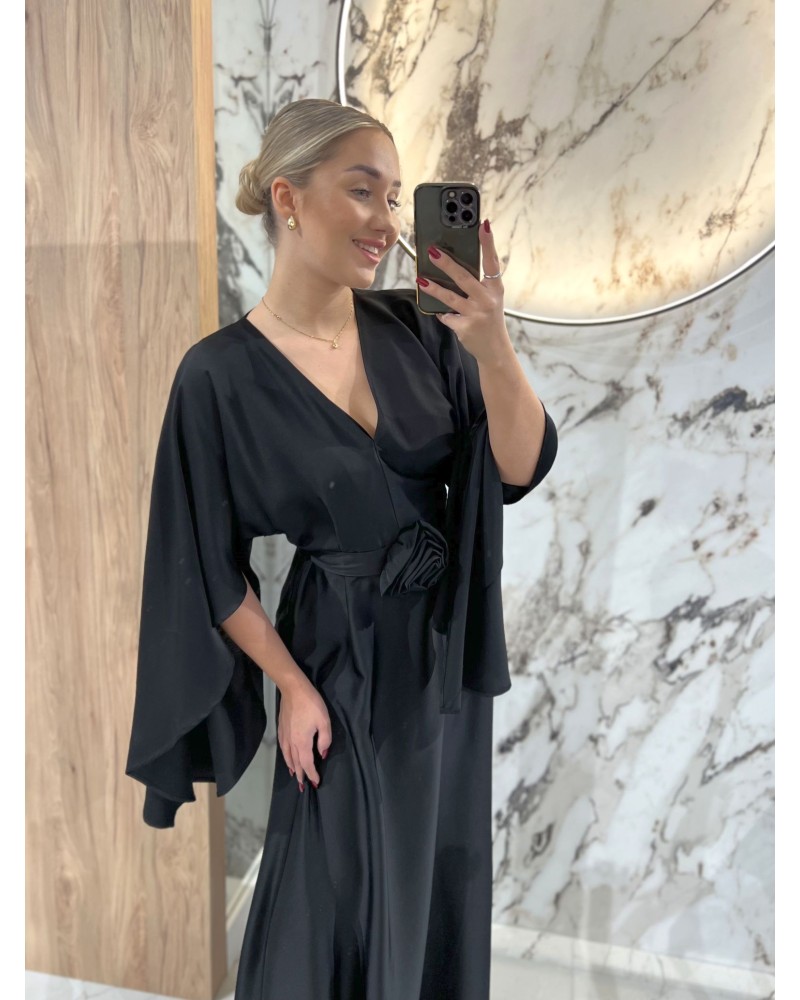 Zwiewne, szerokie rękawy nadają kreacji lekkości i romantycznego charakteru, a ozdobna róża w talii stanowi wyjątkowy akcent, który przyciąga wzrok i dodaje całości szyku.