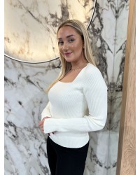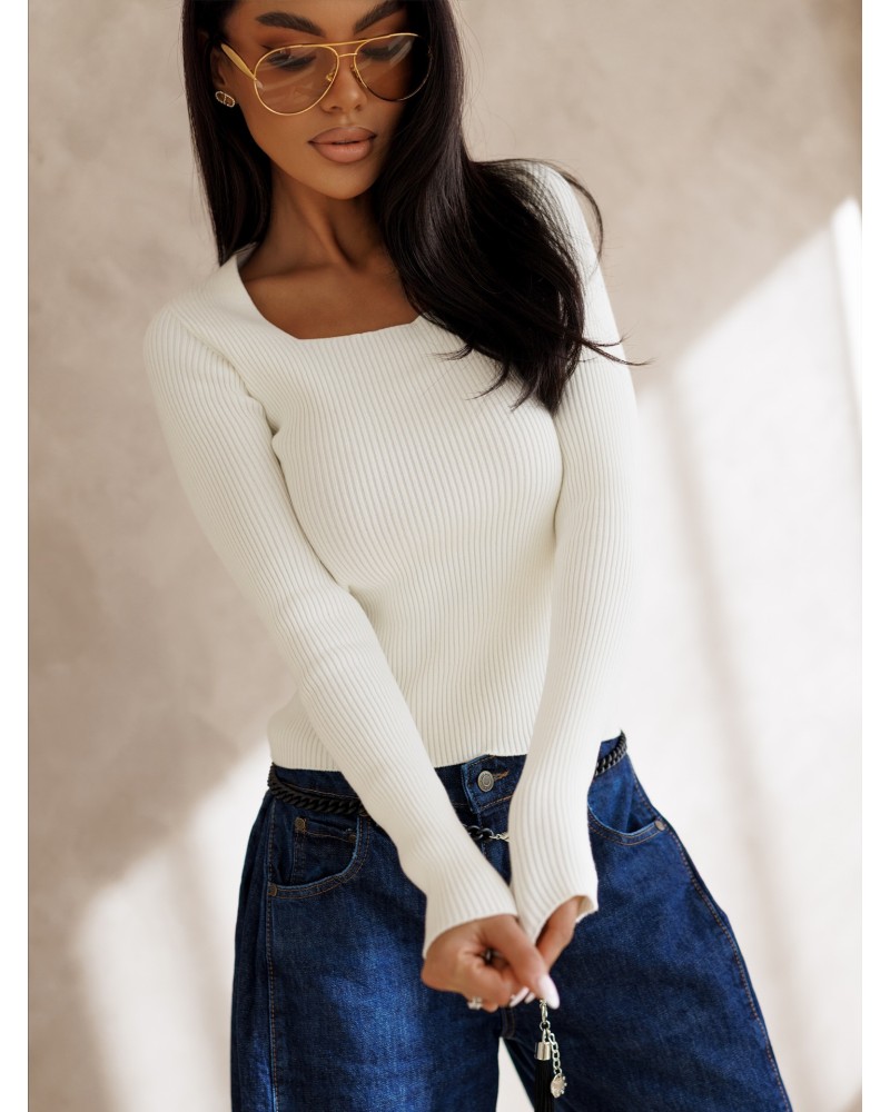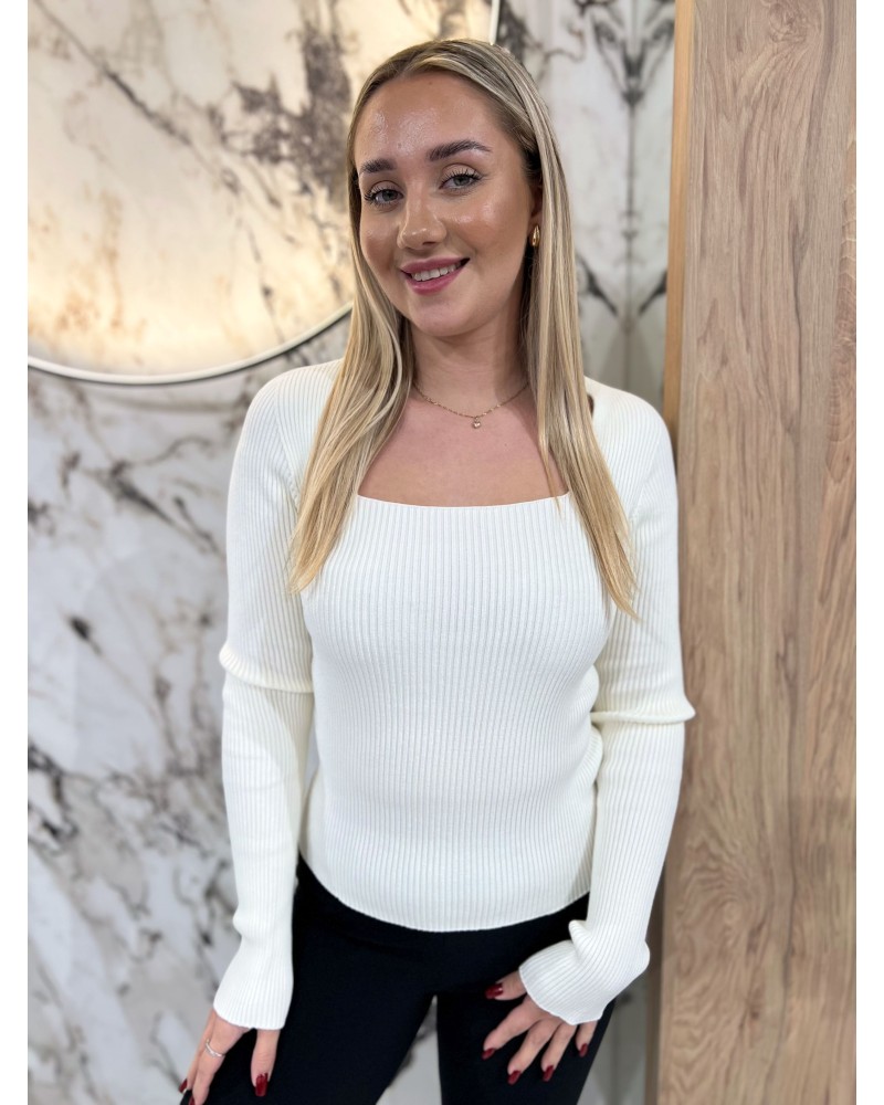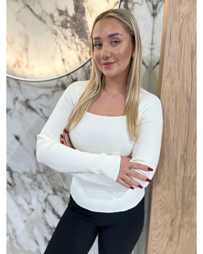 Prążkowany sweterek z dekoltem kwadratowym – klasyczny i kobiecy model, który pięknie podkreśla sylwetkę. Dostępny w kilku modnych kolorach.