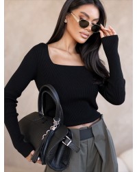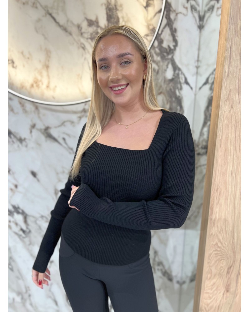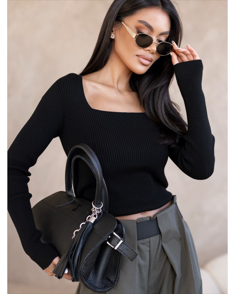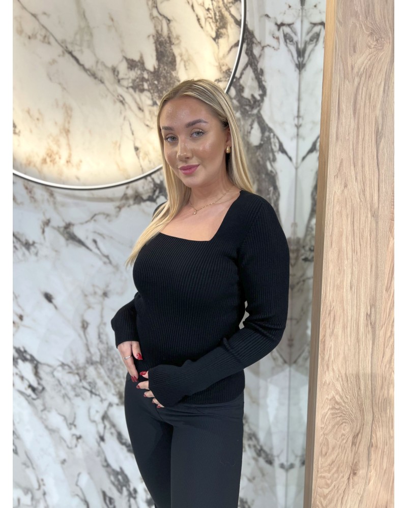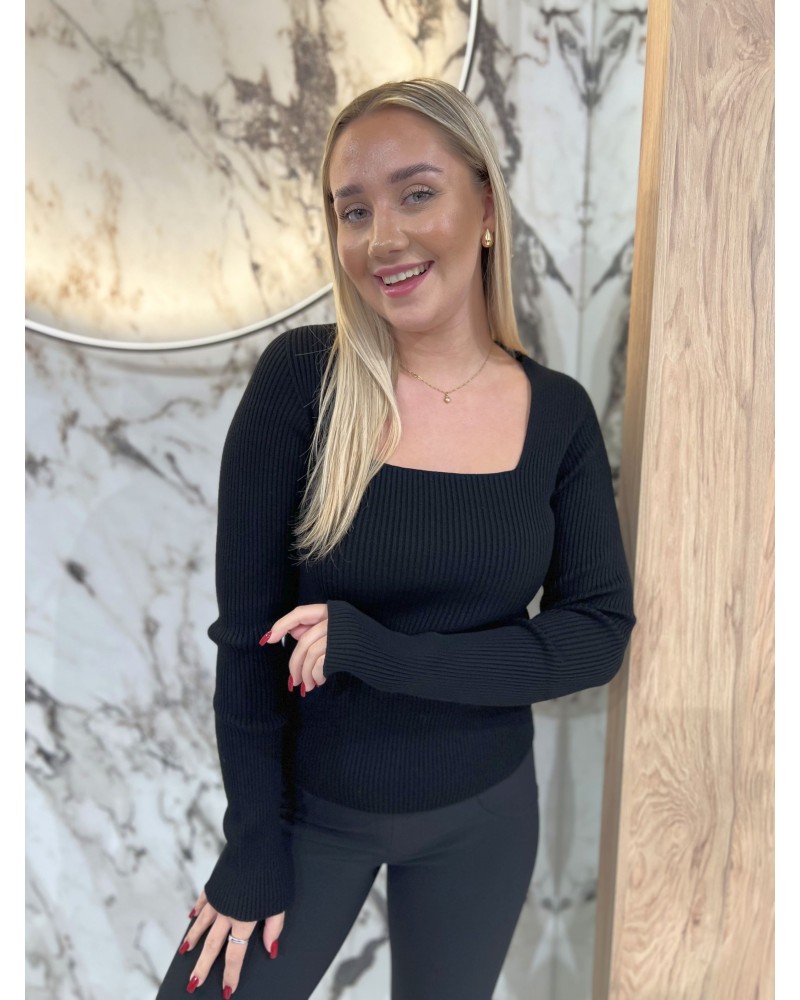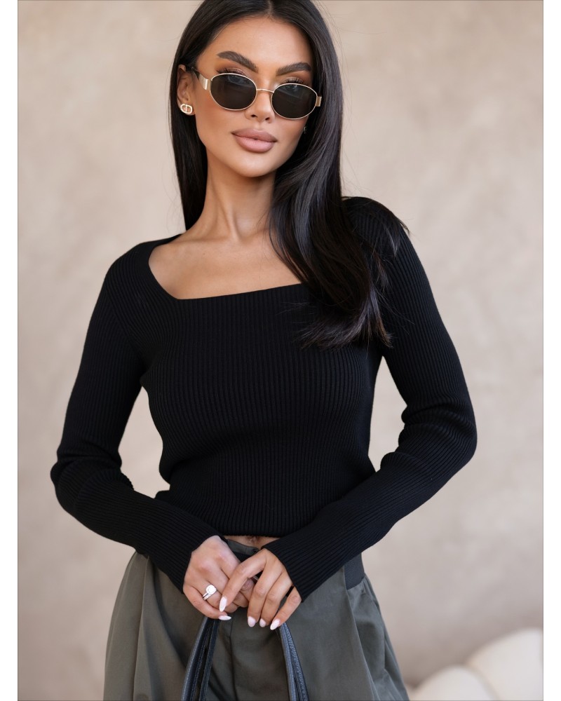 Prążkowany sweterek z dekoltem kwadratowym – klasyczny i kobiecy model, który pięknie podkreśla sylwetkę. Dostępny w kilku modnych kolorach.