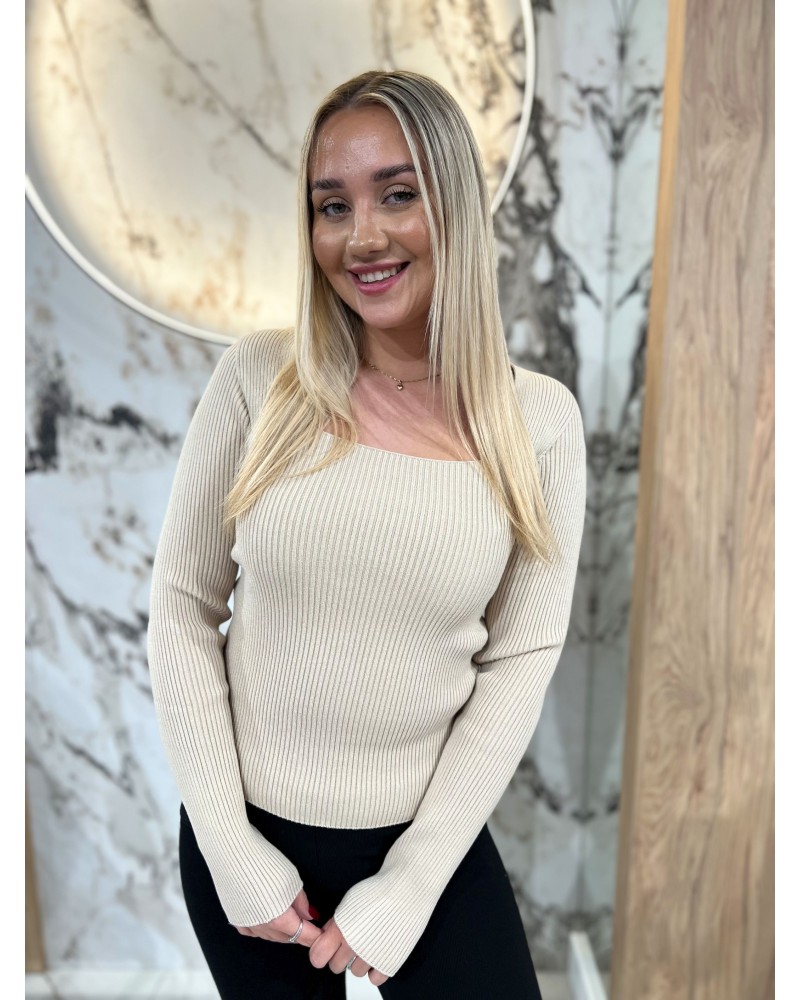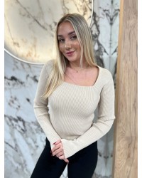 Prążkowany sweterek z dekoltem kwadratowym – klasyczny i kobiecy model, który pięknie podkreśla sylwetkę. Dostępny w kilku modnych kolorach.