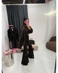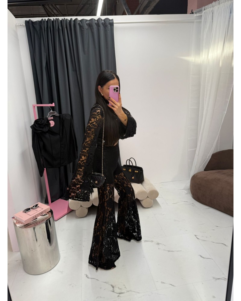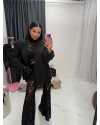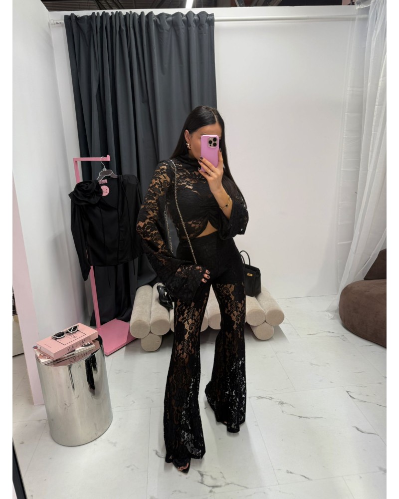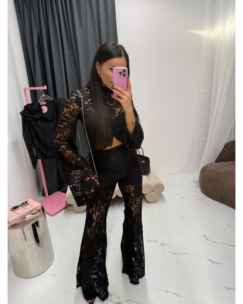 Góra posiada stójkę oraz długie koronkowe rękawy wykończone lekkim rozszerzeniem, co tworzy efekt zmysłowej elegancji. Dodatkowe marszczenie w talii modeluje linię i pięknie podkreśla wcięcie, dzięki czemu bluzka prezentuje się wyjątkowo efektownie zarówno solo, jak i w komplecie.