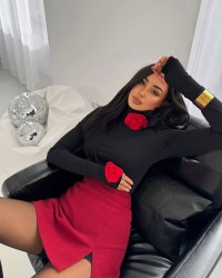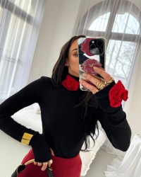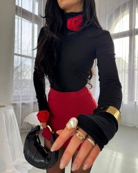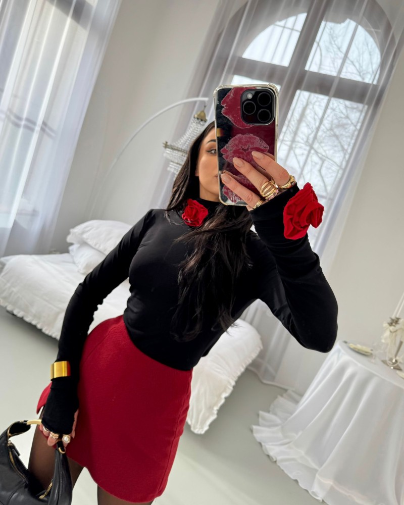 Golf z delikatnymi różami przy szyi i na rękawach to połączenie klasyki z subtelnym romantyzmem. Wykonany z miękkiego, elastycznego materiału, doskonale dopasowuje się do sylwetki, podkreślając kobiece kształty.