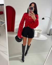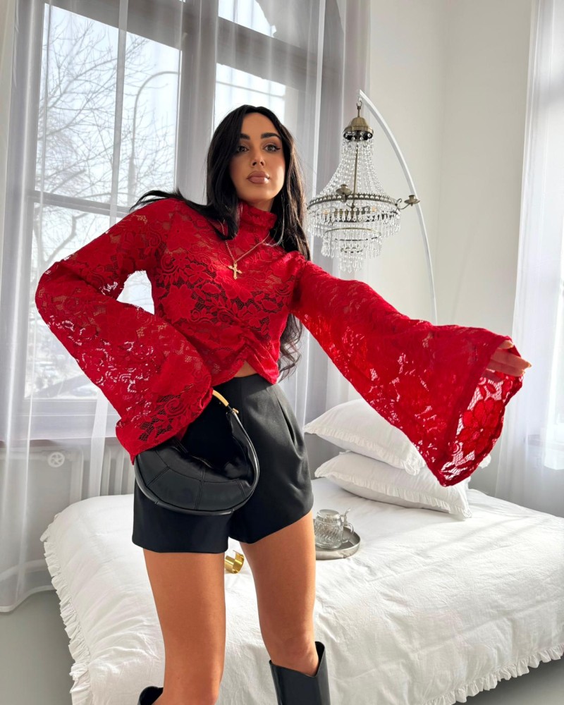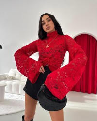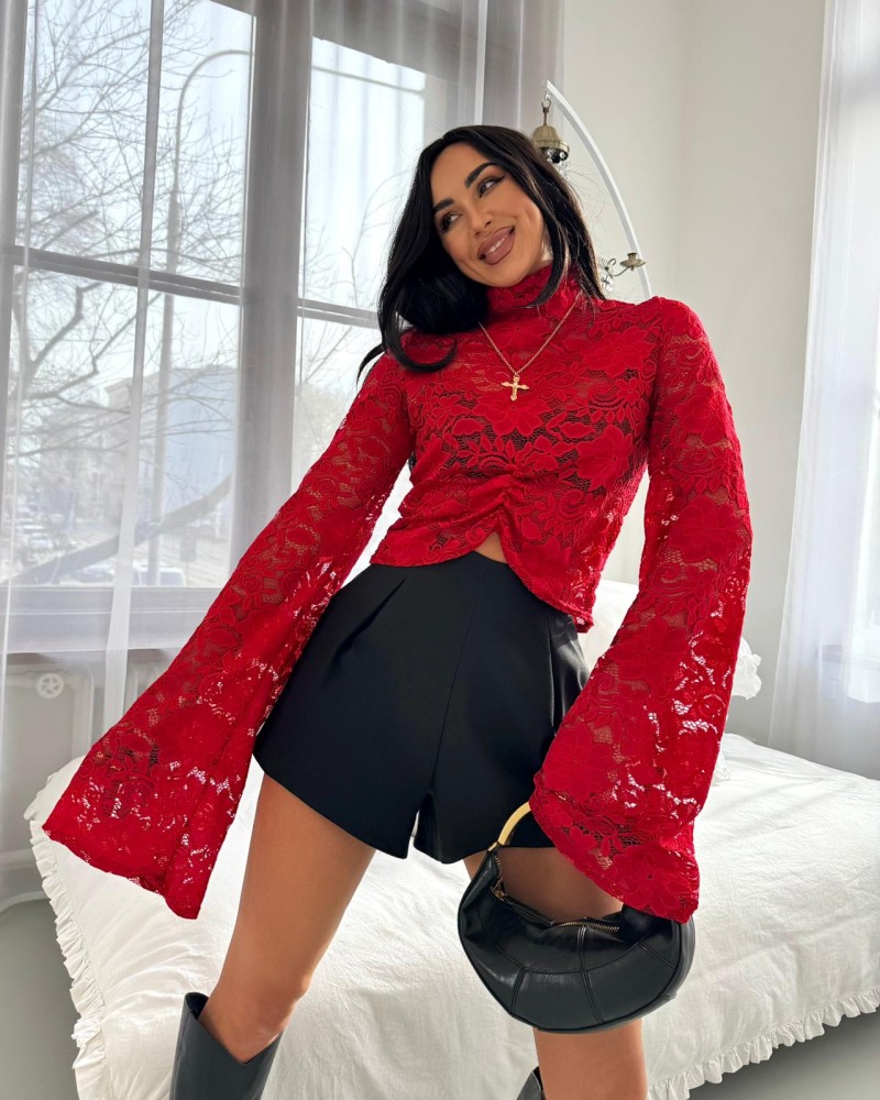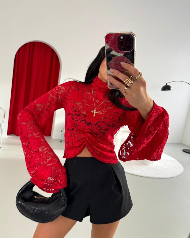 Góra posiada stójkę oraz długie koronkowe rękawy wykończone lekkim rozszerzeniem, co tworzy efekt zmysłowej elegancji. Dodatkowe marszczenie w talii modeluje linię i pięknie podkreśla wcięcie, dzięki czemu bluzka prezentuje się wyjątkowo efektownie zarówno solo, jak i w komplecie.