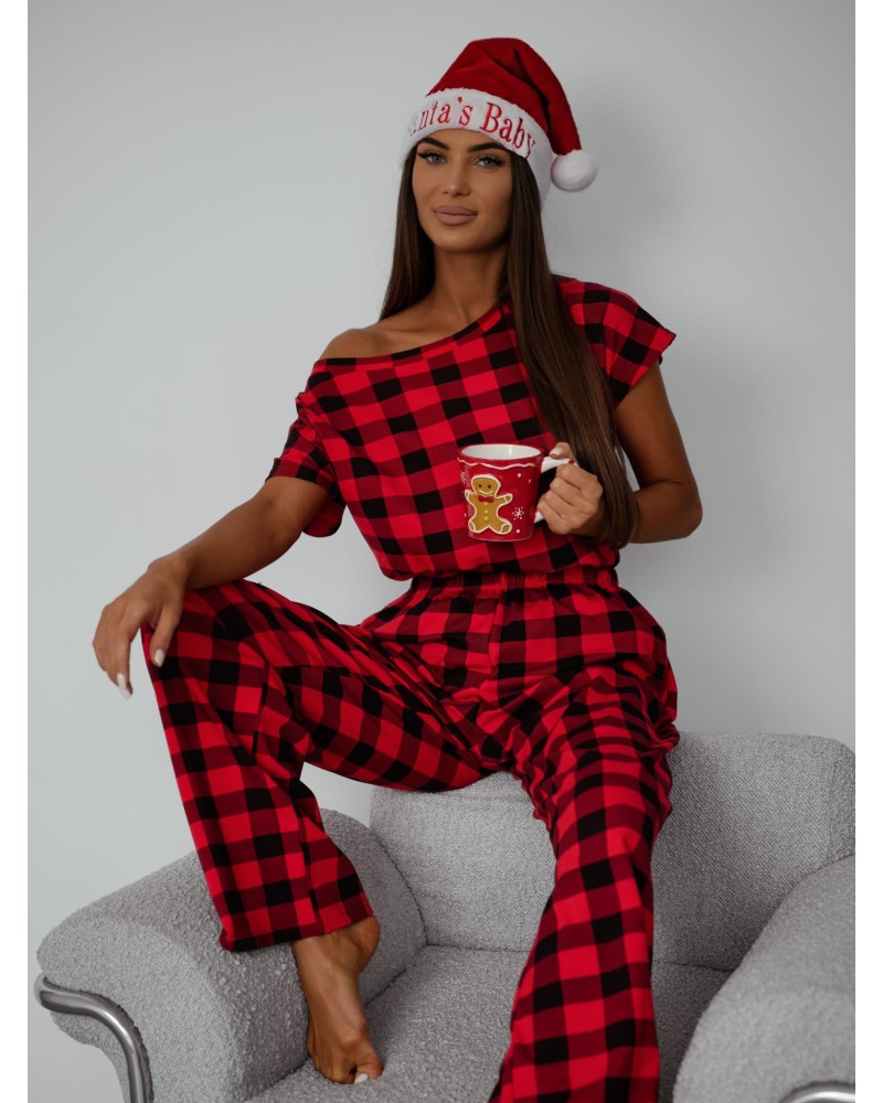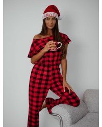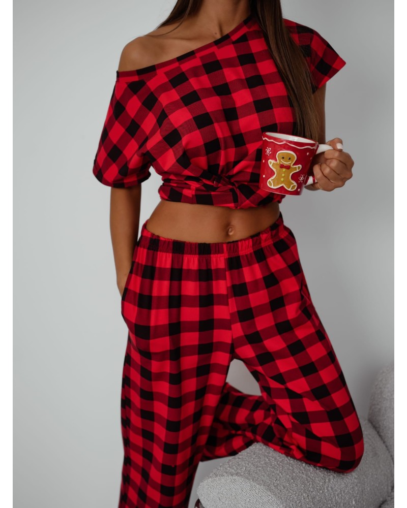 Góra piżamy ma swobodny krój, który można nosić klasycznie lub lekko opuszczony na jedno ramię – to dodaje sylwetce lekkości i podkreśla kobiecy charakter. Spodnie o prostym fasonie delikatnie opadają na nogę, gwarantując komfort i naturalny wygląd. Całość zdobi ponadczasowy wzór kratki, który kojarzy się z sezonem zimowym, atmosferą domowego ciepła i wypoczynkiem.
