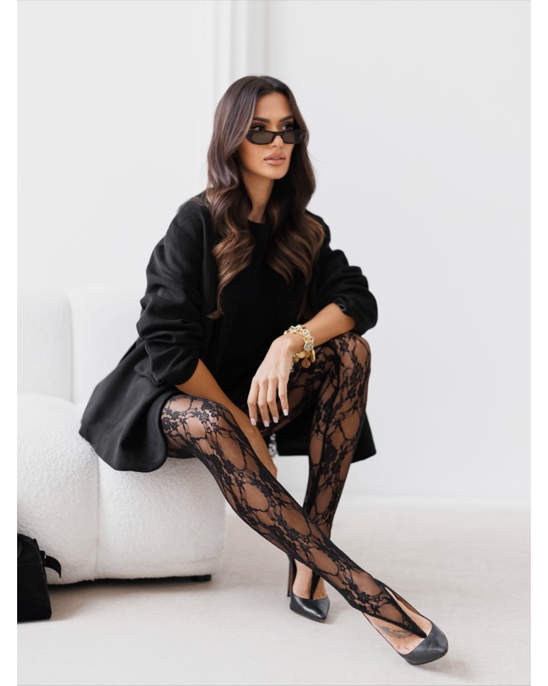 Eleganckie, czarne legginsy koronkowe na palec, stworzone z delikatnej, ażurowej koronki. Idealne jako zmysłowy dodatek do stylizacji lub warstwa pod sukienki i tuniki.