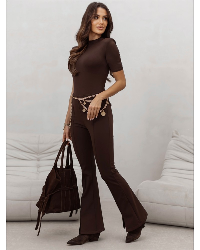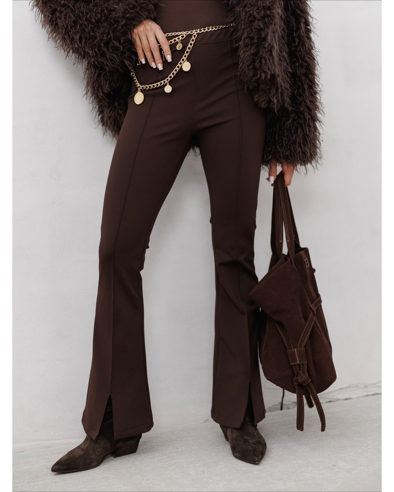 Stylowe materiałowe legginsy typu dzwony z dekoracyjnym przeszyciem, które optycznie wydłuża nogi i podkreśla sylwetkę. Wygodne, elastyczne i idealne do codziennych, modnych stylizacji.