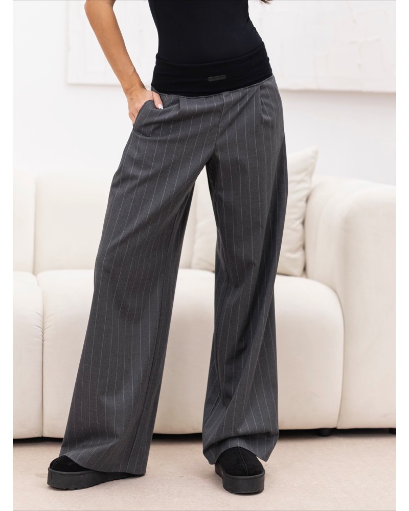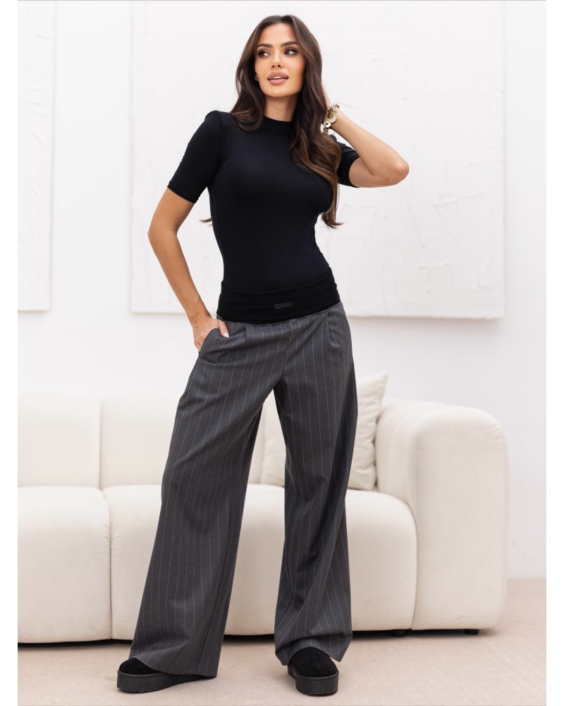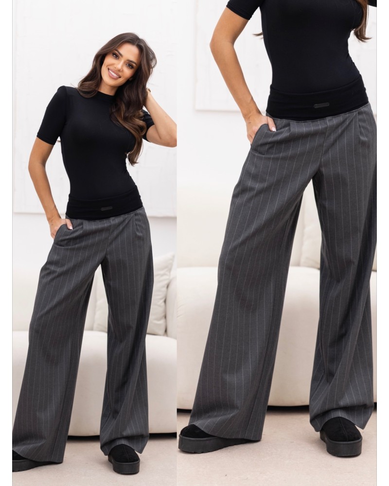 Ich największym atutem jest szeroka, elastyczna guma w pasie – zapewnia idealne dopasowanie, komfort noszenia i subtelnie podkreśla talię, bez uczucia ucisku. Wzór w pionowe paseczki optycznie wydłuża nogi, dodając całości lekkości i elegancji.