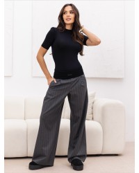 Materiałowe szwedy w paski to połączenie klasyki, wygody i nowoczesnego designu. Wykonane z lekkiej, elegancko układającej się tkaniny, zachwycają swoją swobodą i ponadczasowym charakterem. Linia spodni delikatnie rozszerza się ku dołowi, tworząc efektowne, modne „szwedy”, które pięknie wysmuklają sylwetkę i dodają jej harmonijnych proporcji.