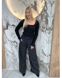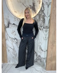 Materiałowe szwedy w paski to połączenie klasyki, wygody i nowoczesnego designu. Wykonane z lekkiej, elegancko układającej się tkaniny, zachwycają swoją swobodą i ponadczasowym charakterem. Linia spodni delikatnie rozszerza się ku dołowi, tworząc efektowne, modne „szwedy”, które pięknie wysmuklają sylwetkę i dodają jej harmonijnych proporcji.