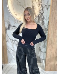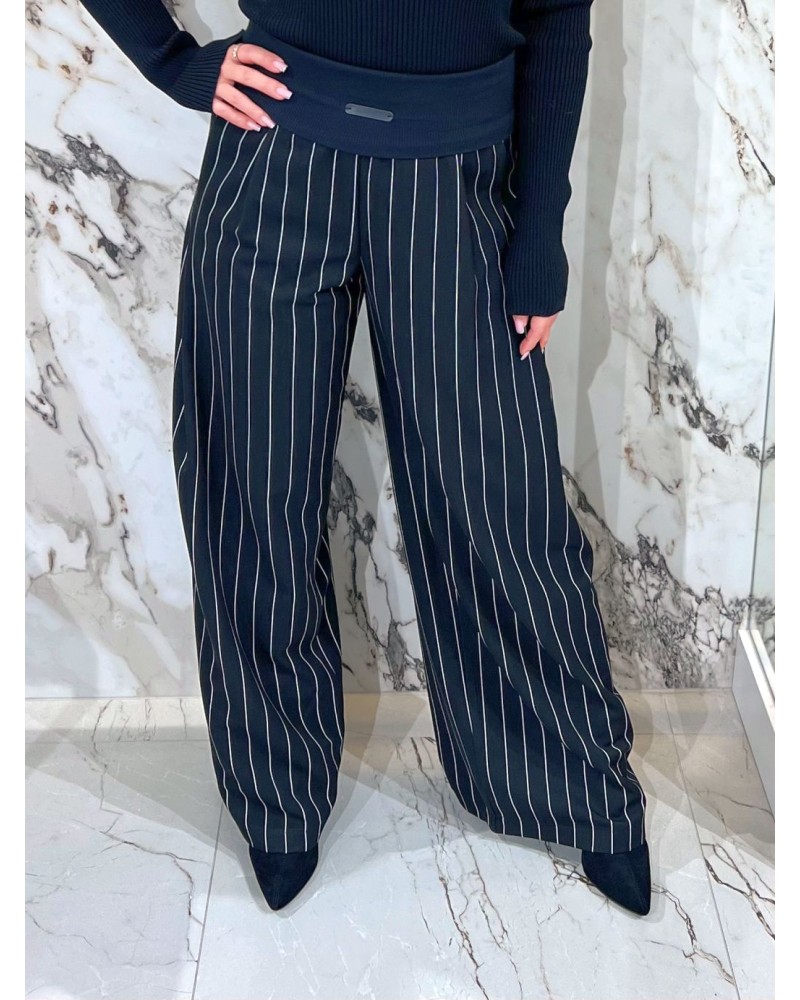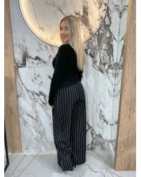 Ich największym atutem jest szeroka, elastyczna guma w pasie – zapewnia idealne dopasowanie, komfort noszenia i subtelnie podkreśla talię, bez uczucia ucisku. Wzór w pionowe paseczki optycznie wydłuża nogi, dodając całości lekkości i elegancji.