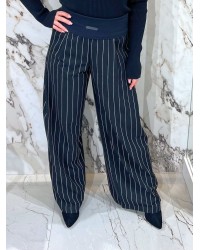 Materiałowe spodnie typu szwedy w paski, z szeroką i elastyczną gumą w pasie. Wygodne, stylowe i idealne do codziennych oraz bardziej eleganckich stylizacji.